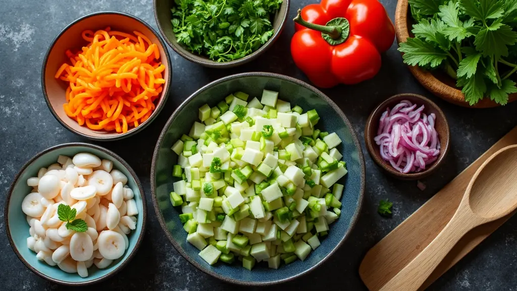 샐러드의 풍미를 극대화하려면 다양한 신선한 채소를 조화롭게 섞는 게 중요해요. 2024년부터 오이, 양파, 미나리, 깻잎, 당근 같은 채소를 오징어초무침과 함께 가볍게 버무리는 방식이 특히 인기를 끌고 있어요. 채소의 아삭한 식감을 살리기 위해 너무 짓이기지 않게 살살 섞어주는 게 핵심이랍니다.